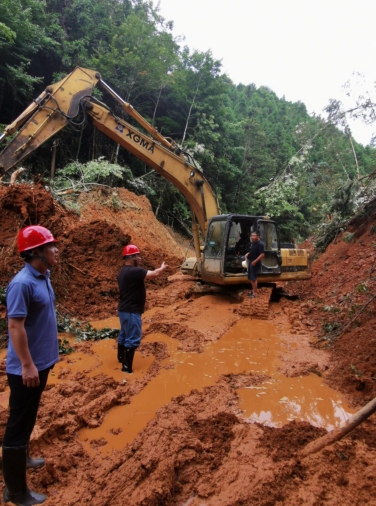 隨后,市政集團(tuán)搶險(xiǎn)救援突擊隊(duì)接到了搶修澄邦村村道的任務(wù),短短5公里3米寬的村道,每幾十米就有一個(gè)坍塌,大型的拖車無(wú)法將挖掘機(jī)運(yùn)送至村里進(jìn)行搶險(xiǎn)救災(zāi)。經(jīng)過(guò)突擊隊(duì)現(xiàn)場(chǎng)研究,制定了采用小型挖掘機(jī)一邊先行搶修道路一邊往澄邦村前行的方案,最后挖掘機(jī)用了5小時(shí)到達(dá)村里開(kāi)始搶險(xiǎn)工作。