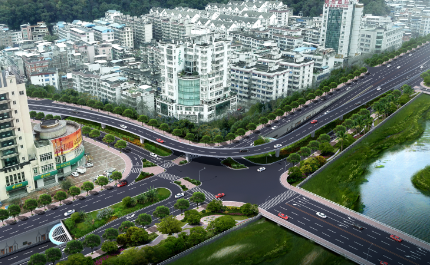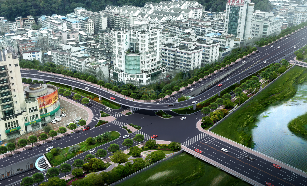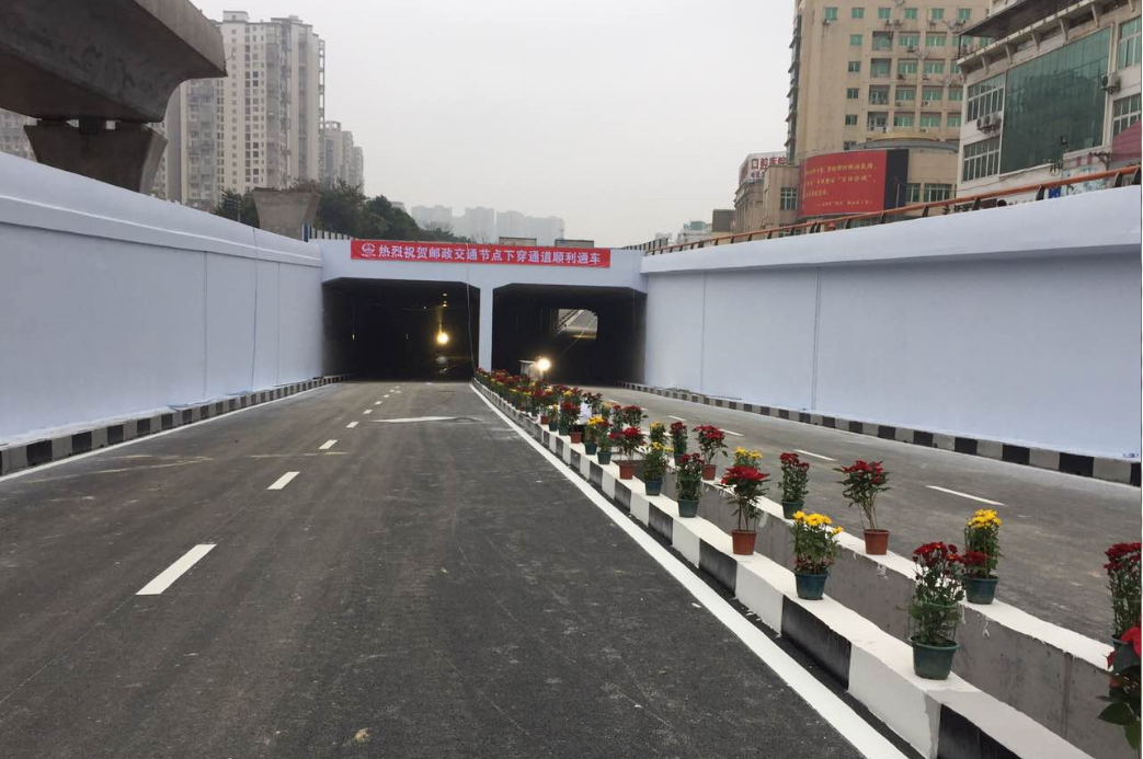 郵政交通節點項目起于蓮莊北路順康汽車檢測中心處,終于瑞德酒店門口,采取“主線下穿、左轉高架”方案,設下穿通道下穿南環西路與南環中路交叉口,全長700米,凈寬2×8.5米,其中暗埋段長度為120米,敞開段(U型槽)長275米;南環路往溪南南路方向設左轉匝道高架,橋長246米,兩側引道擋墻全長117米,項目總投資約1.4億元。